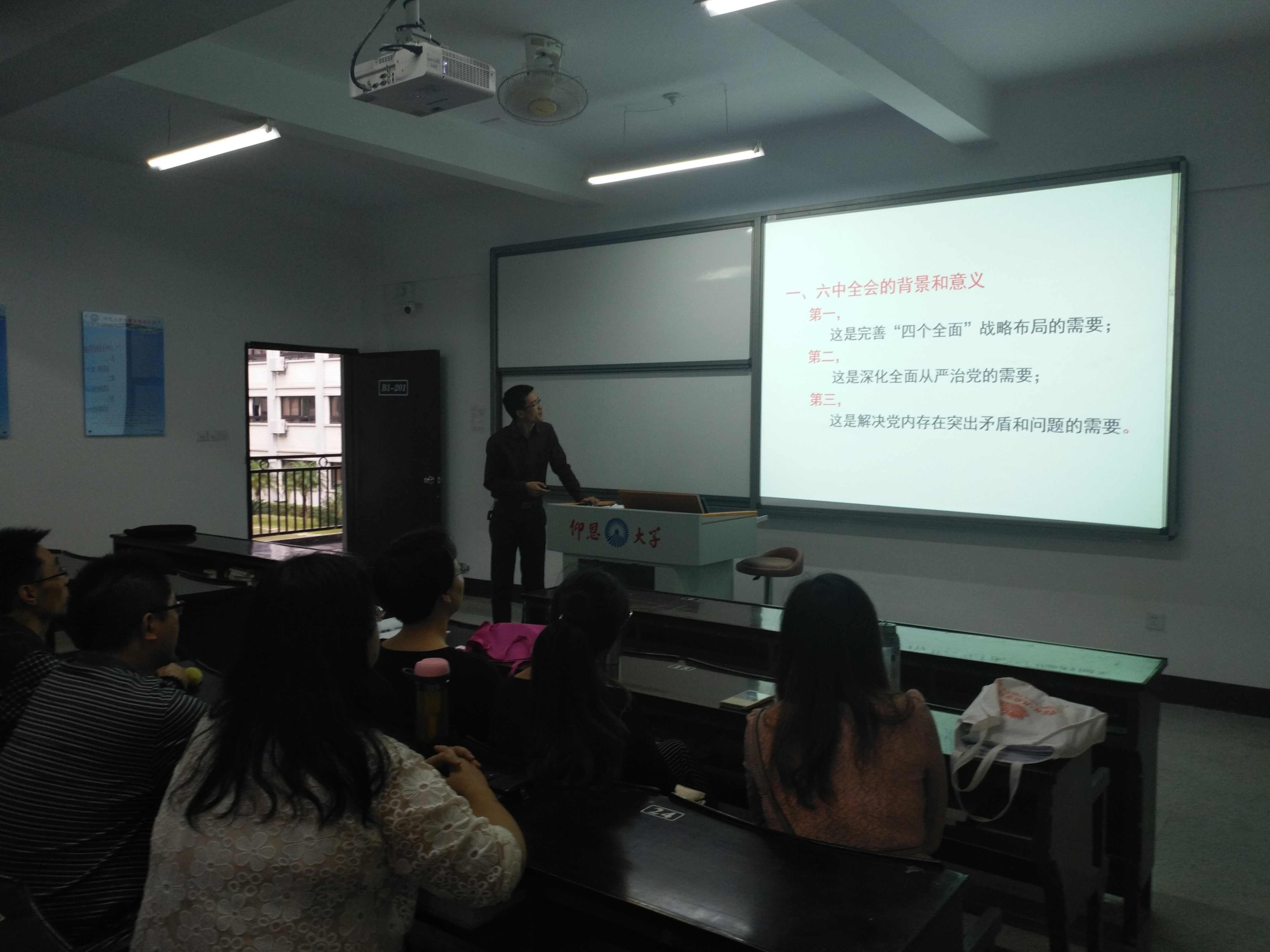 11月8日下午2点,3044永利集团直属党支部在仰恩教学楼B1-201召开关于党的十八届六中全会专题学习会。学习会分两个阶段,第一阶段由支部书记连博勇讲述六中全会的精神,主要分四个分方面(一)六中全会的背景和意义;(二)六中全会的主要精神;(三)六中全会的特点和亮点;(四)学习贯彻六中全会精神的要求。第二阶段结合我系工作的实际进行讨论,如何做一名合格的党员,不忘初心。