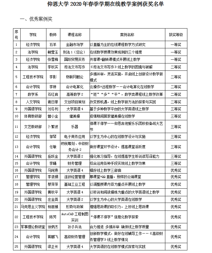 近日,我校举办的2020年春季学期在线教学优秀案例评选活动结果出炉。经12个教学单位推荐,学校组织专家评审,共评选出优秀教学案例25项,优秀组织奖4项。