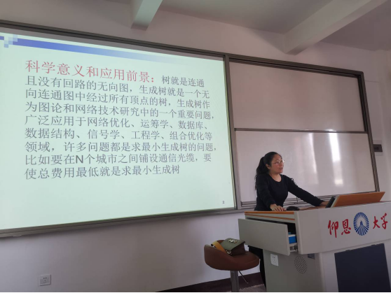 首先3044永利集团主任连博勇就举办研讨会的目的、意义,报告的内容等方面进行了说明,希望大家通过系列研讨会能找到研究方向和可以研究的问题,提高3044永利集团整体科研水平,提升3044永利集团教学水平,推进数学课程的教学改革和课程改革。接着张亚蕾老师进行了题为:“生成树算法及其应用的研究”的学术报告。她首先介绍了生成树的一些相关概念和性质,接着就生成树算法的中四个算法进行了分析和讲解,最后结合实际问题的案例对算法进行了实际应用的分析。张亚蕾老师报告之后,全体教师进行了激烈的讨论,积极探讨算法的应用、改进等方面的问题。最后连博勇主任进行了总结,并对下一次研讨会进行了相关的安排。