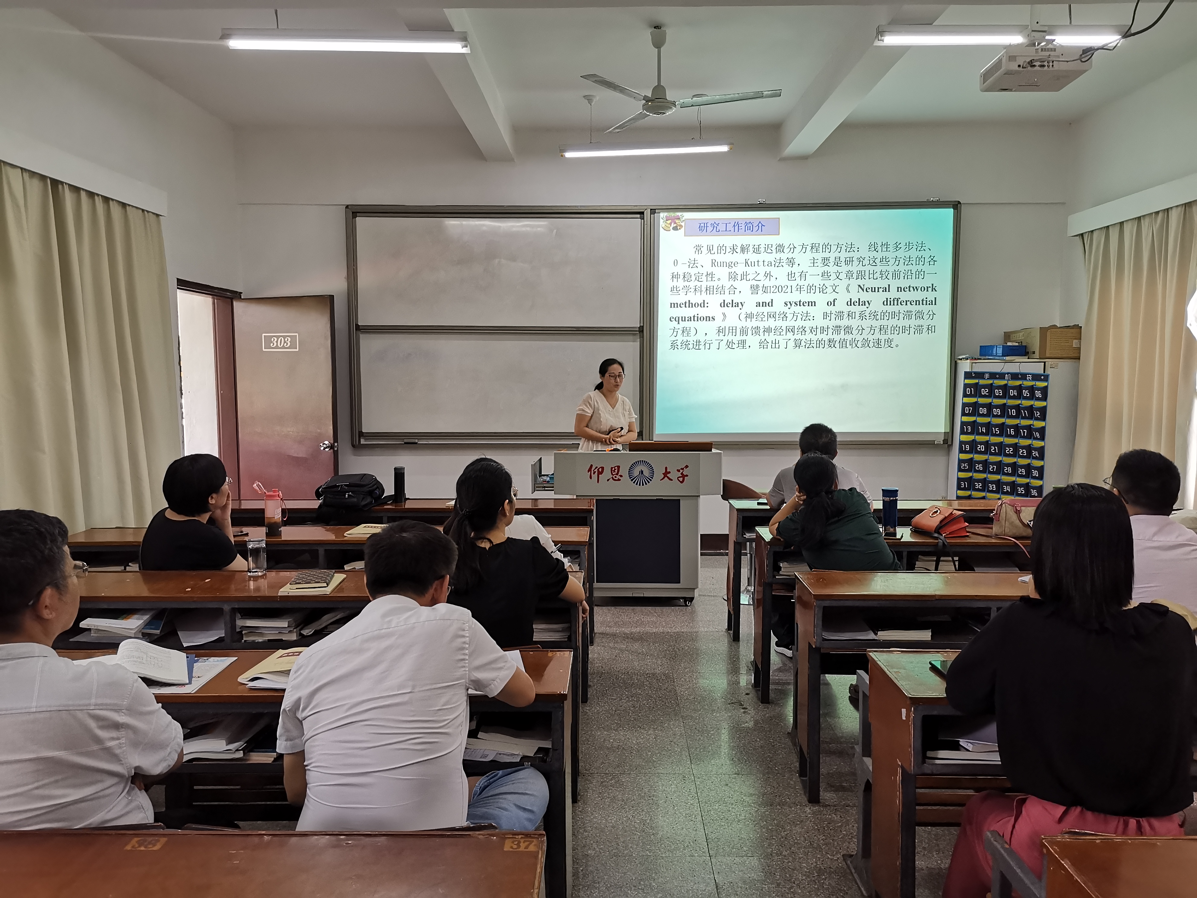 首先,由时秀娟老师进行了题为《延迟微分方程简介》的学术报告,她首先介绍了延迟微分方程的形式、研究意义及常见研究方法,接着针对新型冠状病毒肺炎疫情,讲解了一类基于延迟微分方程的传染病模型,通过对模型建立的方法讲解及其模拟效果的展示,说明延迟微分方程在新型冠状病毒疫情预测中的实际应用价值,最后通过几个典型的模型简单介绍了延迟微分方程在其它领域的应用。