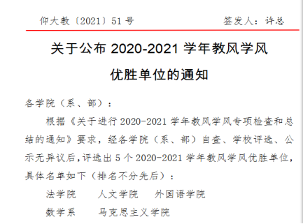 日前,永利集团30442020-2021学年教风学风优胜单位评比揭晓,我系获评优胜单位。这是我系连续第5个学年获此殊荣。