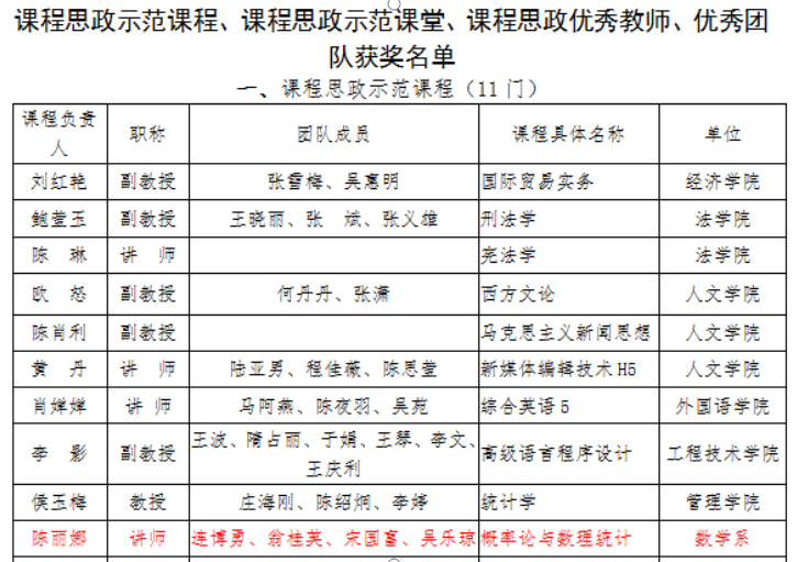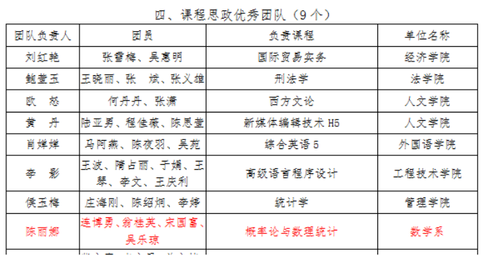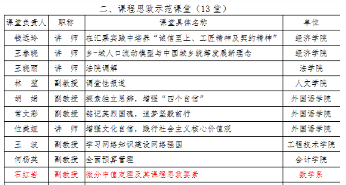 课程思政元素融入课程教学过程,有利于强化课程教学过程中的思想教育和价值引领作用,有利于推进“三全育人”大格局的形成,是落实立德树人根本任务的具体体现。近年来我系不断加强课程思政教学理论学习,并结合数学课程特点不断探索实践。本次获奖充分肯定了老师们的努力和付出,同时也表明了我系课程思政教学实践研究获得学校认可,初见成效。