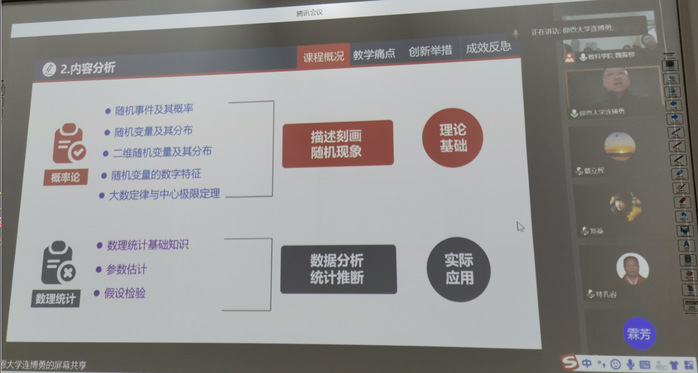 报告中,连博勇教授从课程概况与教学痛点、创新举措和成效反思四个方面介绍了《概率论与数理统计》课程教学的综合改革情况与取得的成效,以及应用于各类教学竞赛的情况;重点从创新举措方面解读了创新教学竞赛赛制。报告结束后,在座的老师就相关问题进行了探讨和交流。