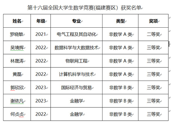 第十六届全国大学生数学竞赛于2024年11月9日举行,本次比赛全国有来自1500余所高校的32.5万大学生参加。我校参赛学生获得福建省二等奖1项,三等奖6项的好成绩。
